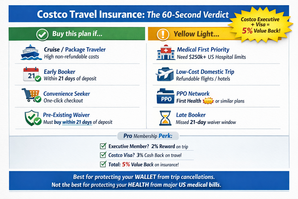 Bottom line: buy Costco Travel Insurance when the trip has enough prepaid, non-refundable value to justify protection and the plan matches the risk you actually want to insure.